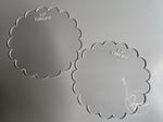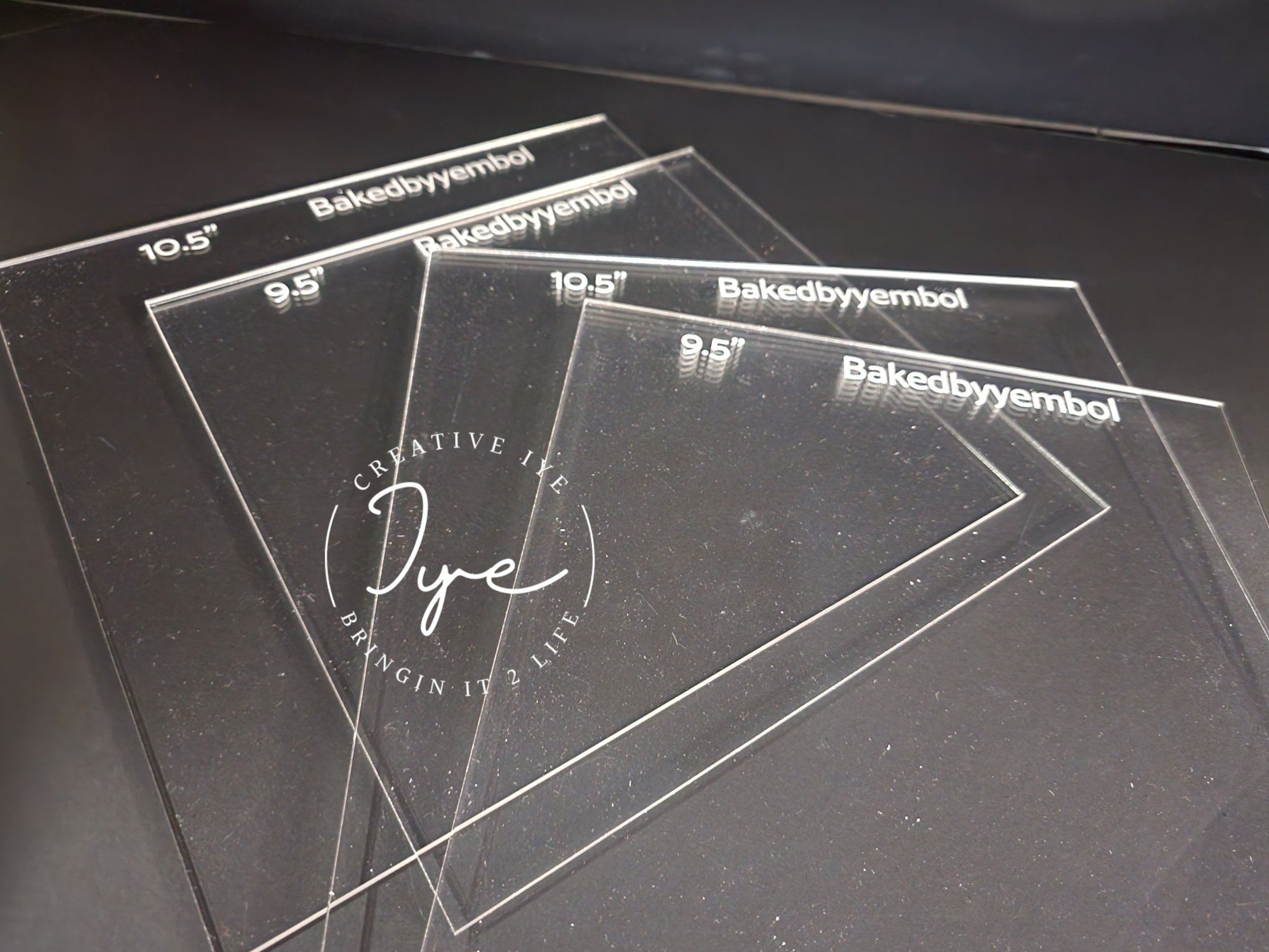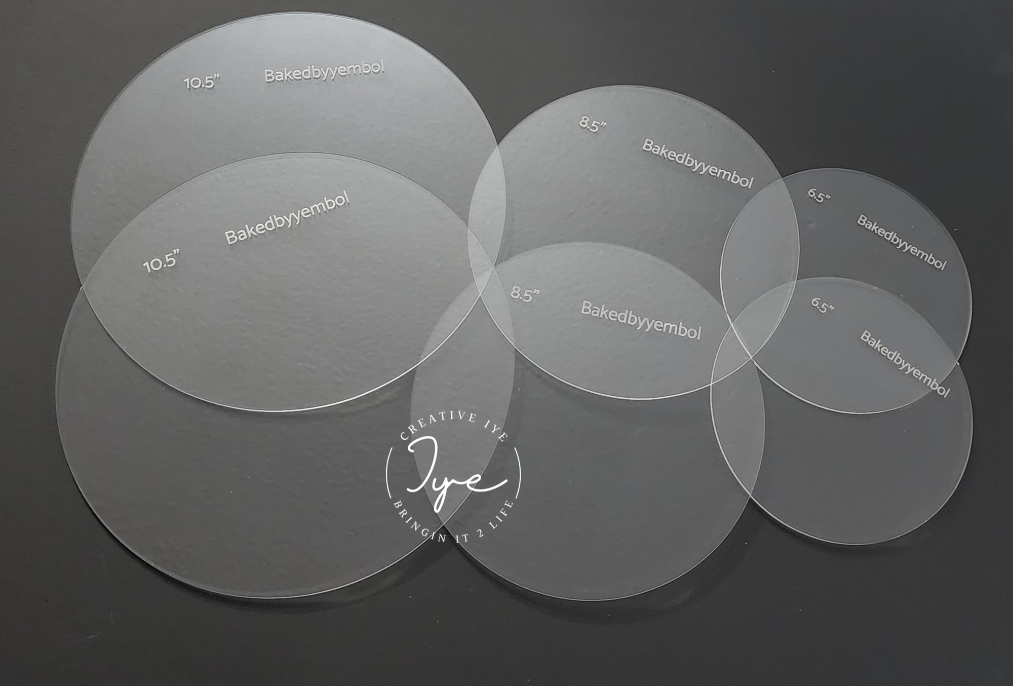 Acrylic Cake discs come in size 3 to 11" rounds, and square. You also have the option of getting a different shape. Using our new and improved 4.5mm thickness, these do not warp in warm water and come engraved with your business name.